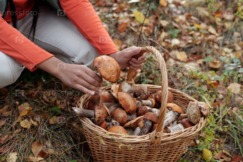 Руки молодой самки-выборщицы грибов, держащей оранжевый кепка boletus