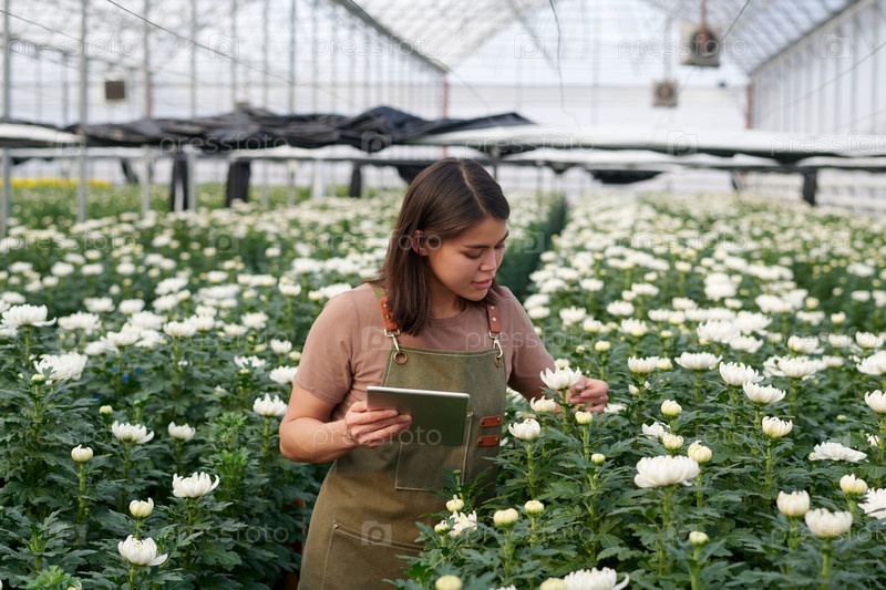 Молодая садовница с планшетом смотрит на цветущую белую хризантему