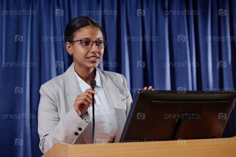 Деловая женщина в костюме выступает на конференции