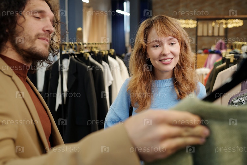 Молодая пара смотрит на новую сезонную коллекцию одежды