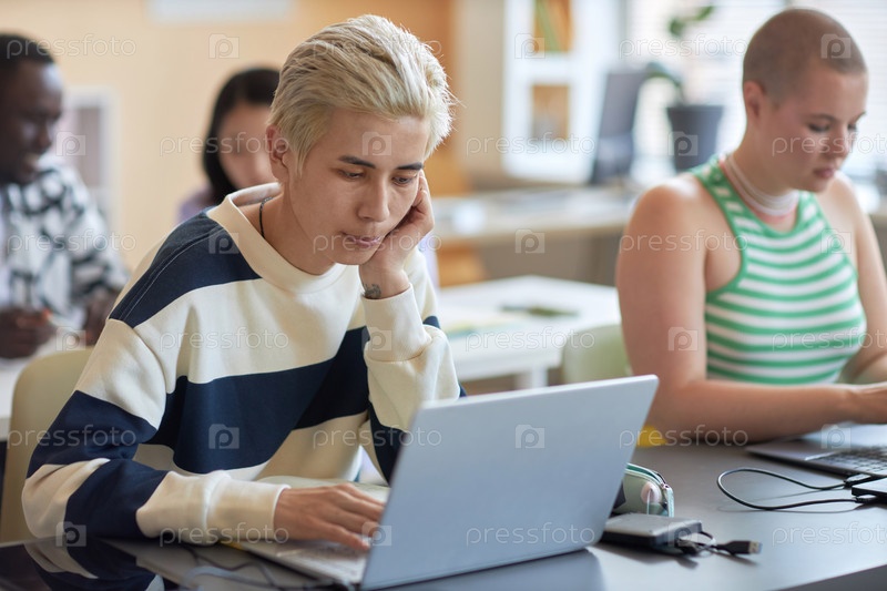 Молодой азиатский блондин в пуловере сидит перед экраном ноутбука