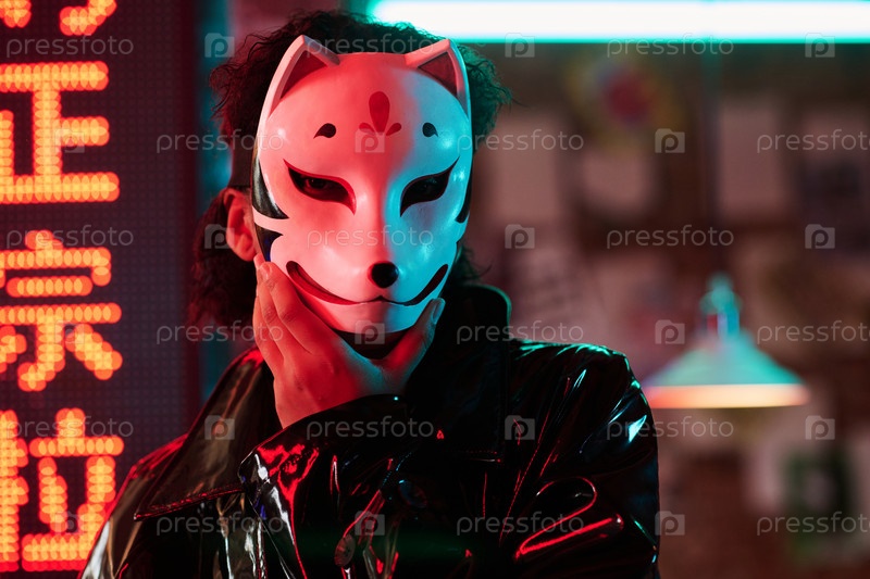 Молодая женщина в лисистой маске стоит против иероглифа, означающего лучший рамен