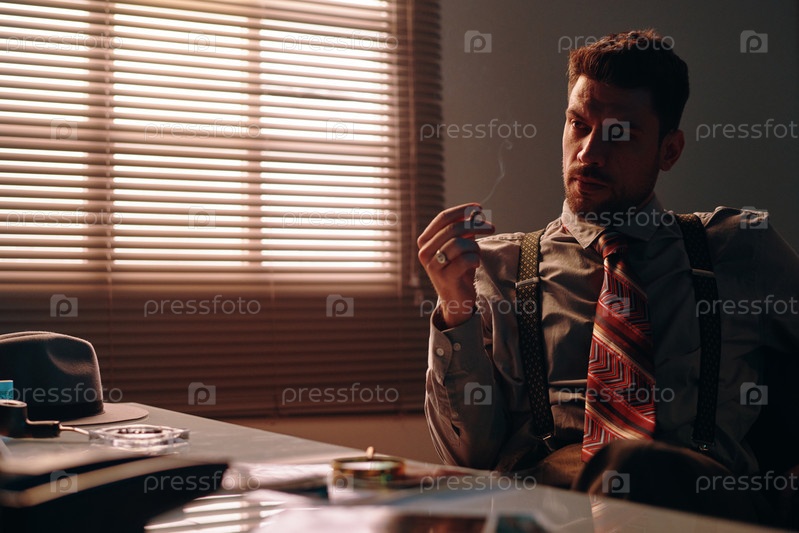Молодой задумчивый бизнесмен в ретро формальной одежде держит сигарету