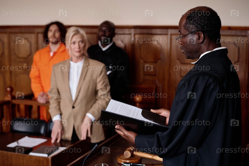 Уверенный в себе зрелый мужчина-судья в черном плаще, объявляющий приговор заключенному