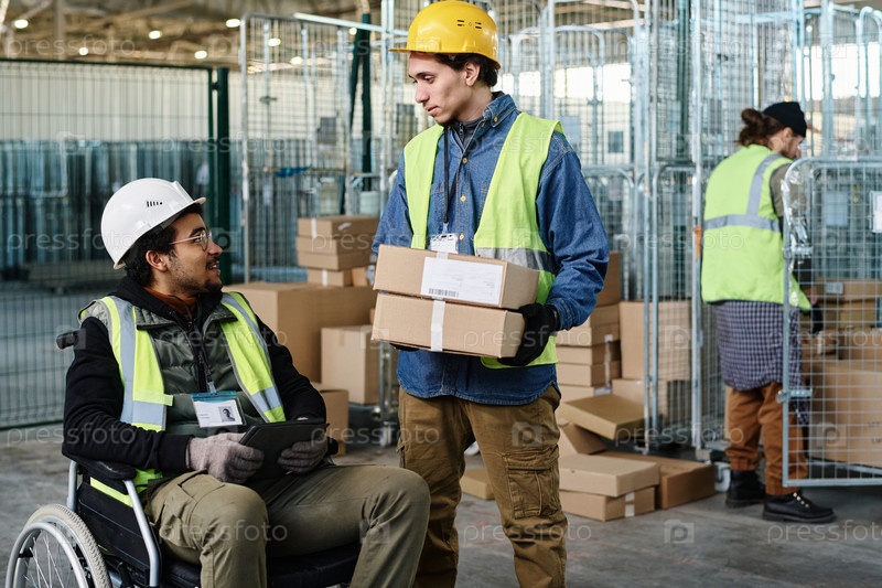 Молодой инженер с коробками разговаривает с коллегой в инвалидном кресле, используя планшет