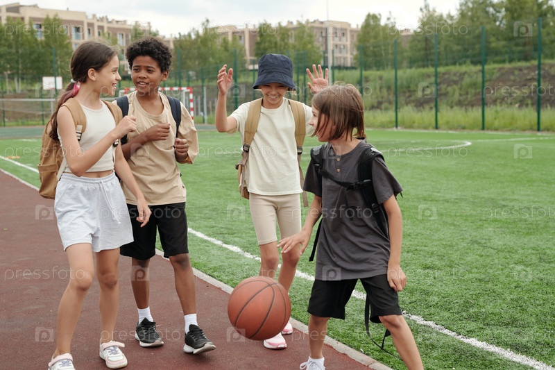 Группа межкультурных одноклассников в активной одежде, идущих по треку