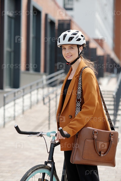 Улыбающаяся фрилансерка или офисный менеджер в шлеме, смотрящий на камеру
