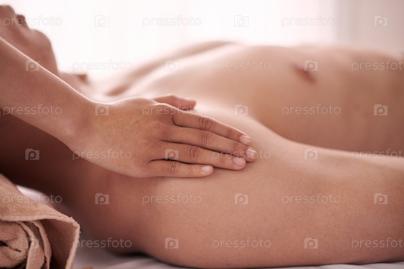 Руки молодой массажистки на плече спокойного парня, лежащего на диване