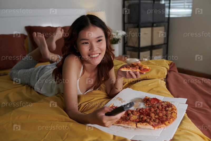 Девушка ест пиццу и смотрит комедийный фильм