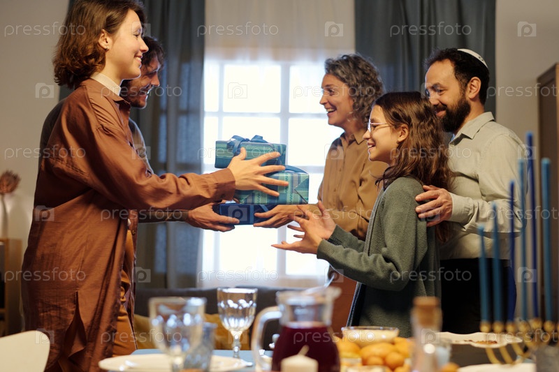 Счастливая еврейская семья из пяти человек дарит друг другу подарки