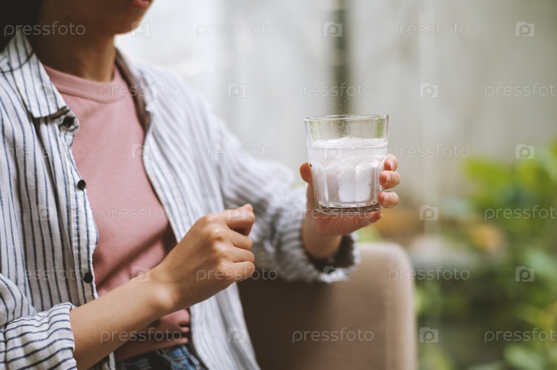 Обрезанное изображение молодой женщины, принимающей стакан воды с газированной таблеткой