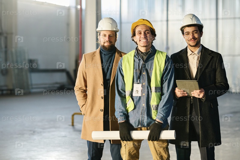 Группа счастливых молодых межкультурных мужчин в шапках, смотрящих на камеру