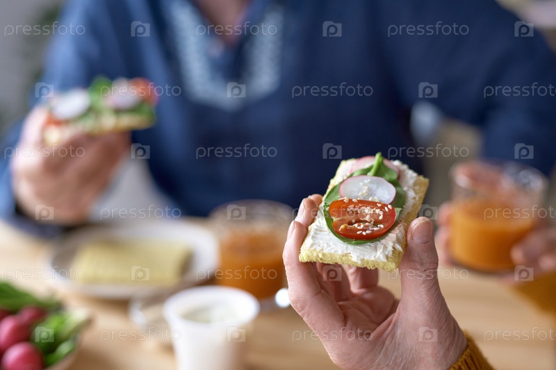 Пожилая женщина ест бутерброд с овощами