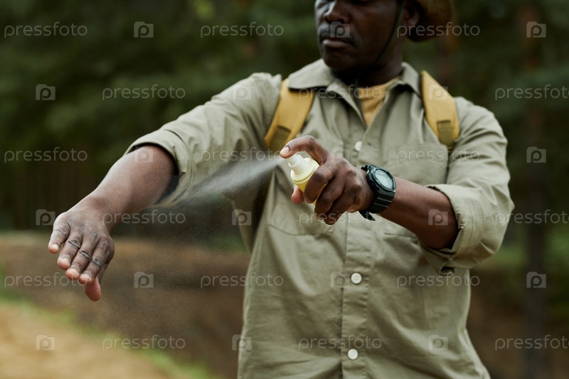 Мужчина, использующий спрей от комаров на открытом воздухе
