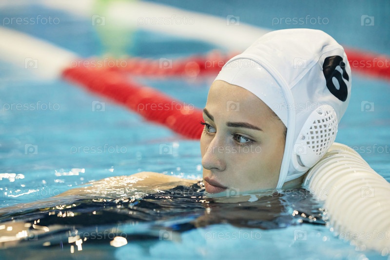 Близкий портрет молодой спортсменки в купальной шапке, стоящей у финиша