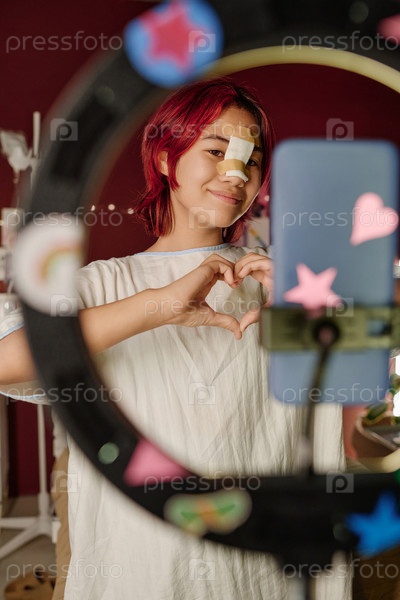 Счастливая девочка-подросток, делающая форму сердца руками перед смартфоном