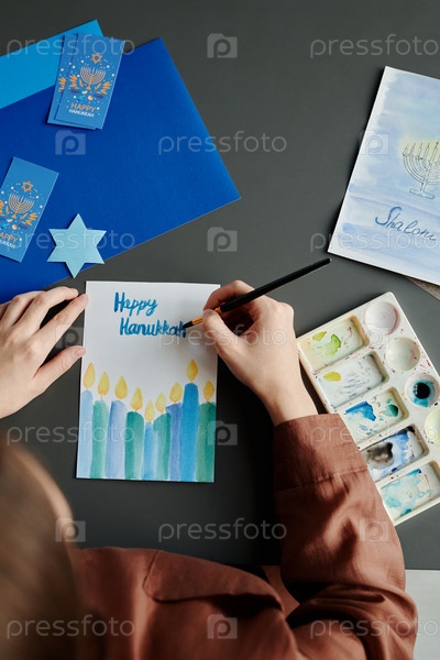 Высокий угол рук молодой женщины, записывающей счастливую Хануку