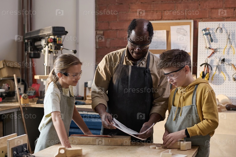 Старший чернокожий мужчина работает над плотничьим проектом с улыбающимися детьми в мастерской
