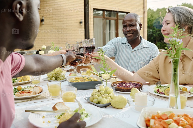 Счастливая зрелая пара со стаканами вина, выпившая за своего сына и его жену