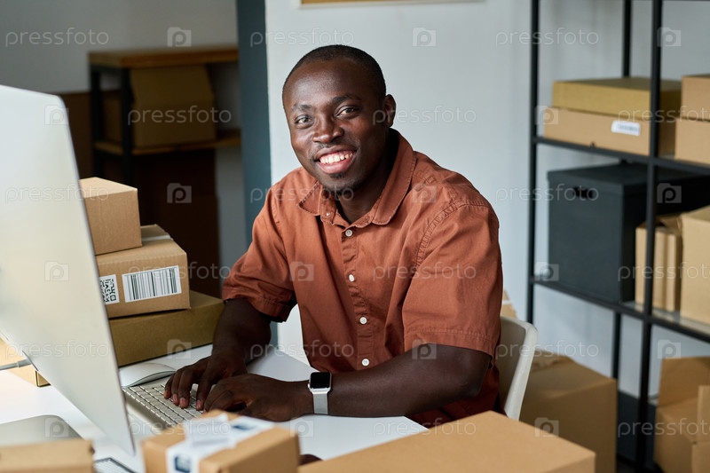 Счастливый молодой афроамериканец в коричневой рубашке смотрит на камеру