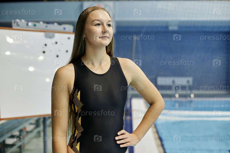 Молодой успешный профессионал по водному поло в купальниках стоит у бассейна