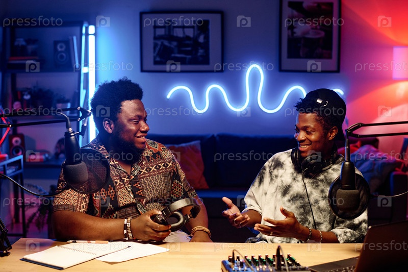 Два молодых афроамериканских мужчины в стильной повседневной одежде сидят в студии