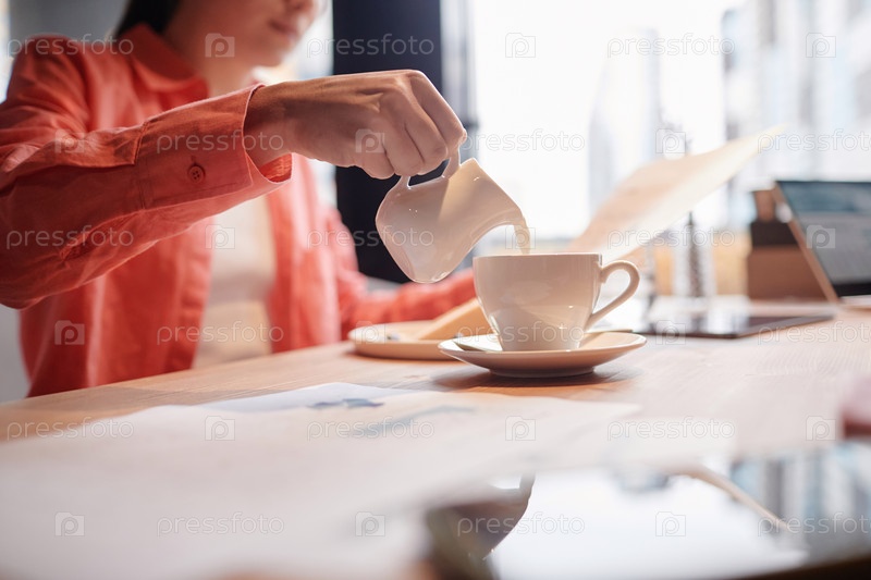 Деловая женщина в коралловой рубашке наливает свежее молоко или сливки в чашку кофе