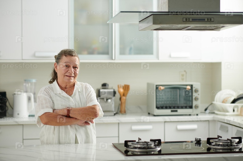 Пожилая женщина стоит у кухонной стойки
