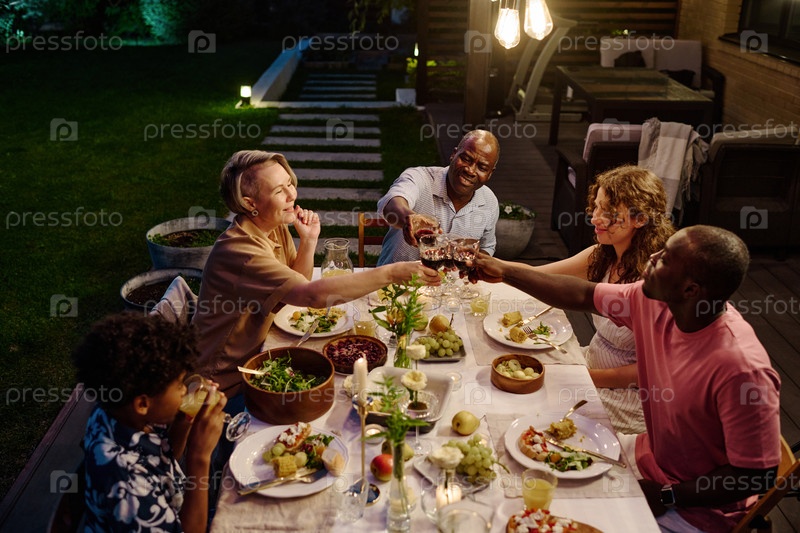 Большая веселая семья из пяти межкультурных членов, соприкасающихся с напитками