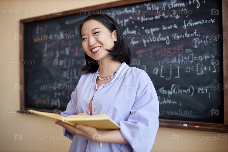 Счастливая молодая азиатская учительница с открытой книгой, смотрящая на учеников