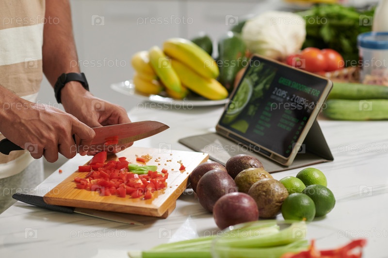 Руки молодого современного человека с острым ножом режут свежие красные капсикумы
