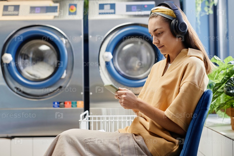 Боковой вид молодой женщины, прокручивающей плейлист на смартфоне