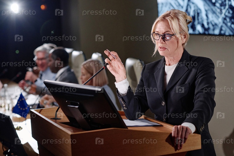 Деловая женщина, выступающая в микрофоне на конференции