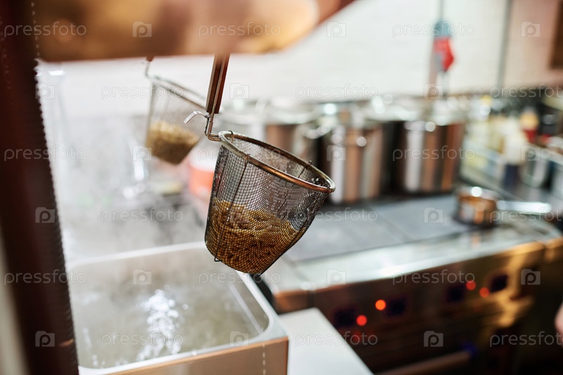 Сосредоточьтесь на одном из двух металлических коландеров с вареным раменом, висящим над раковиной