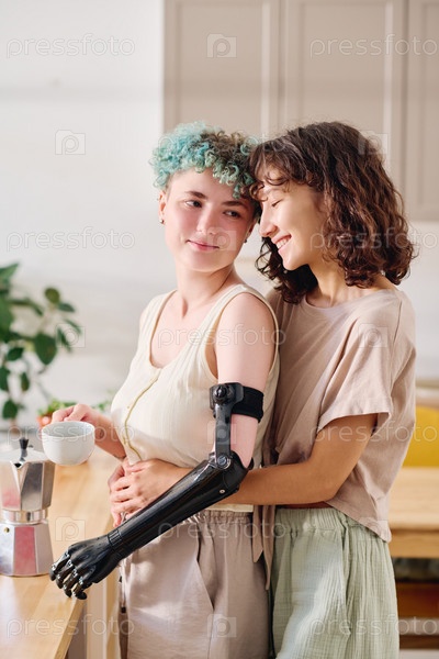 Молодая женщина-инвалид держит чашку кофе и смотрит на счастливую подругу