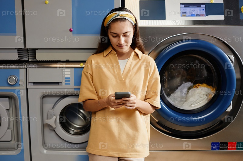 Красивая женщина в повседневной одежде смотрит на экран смартфона и отправляет сообщения