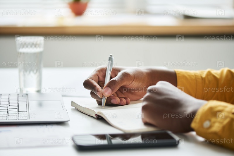 Фокус на руке молодого бизнесмена, держащего ручку над страницей открытой тетради