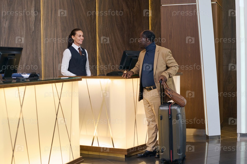 Человек с багажом регистрируется в отеле