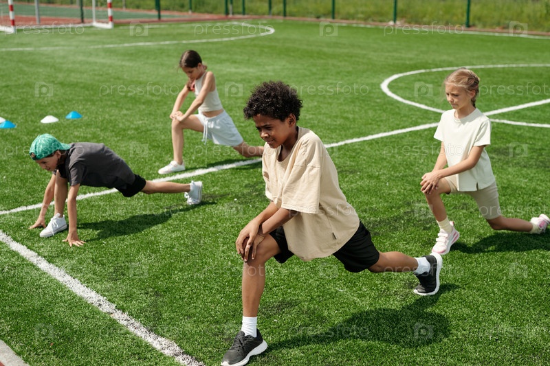 Афроамериканский школьник делает растяжные упражнения на зеленой траве
