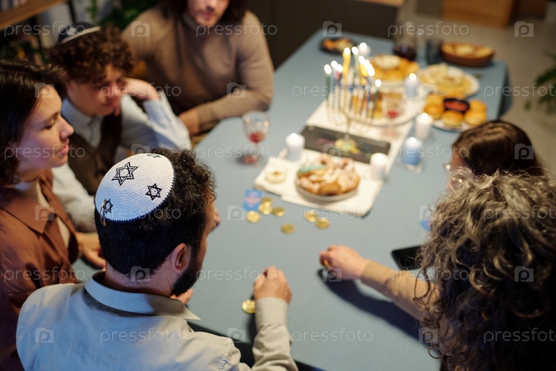 Высокий угол зрелого еврейского мужчины с киппой на голове, сидящего среди женщин