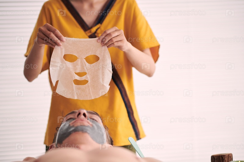 Молодая косметолог-женщина держит маску над спокойным клиентом