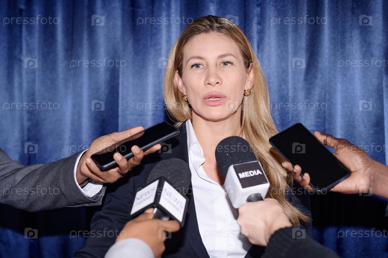 Зрелая бизнесвумен разговаривает с журналистами
