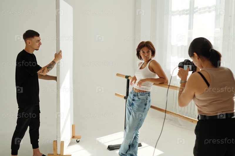 Молодая красивая модель моды в повседневной одежде позирует для профессионального фотографа