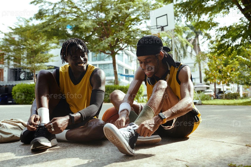 Игроки в уличный баскетбол надевают кроссовки