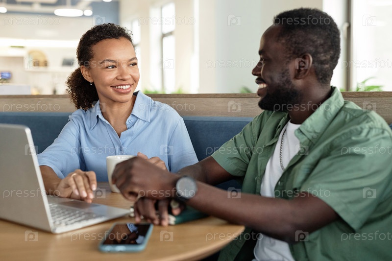 Деловая пара работает над ноутбуком в кафе