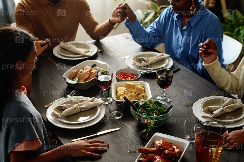 Руки членов семьи во время молитвы за столом с домашней едой и напитками