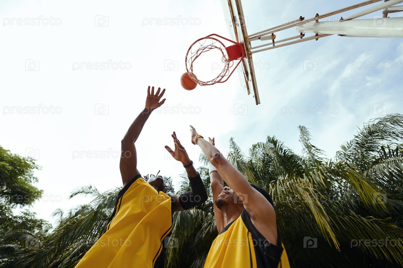 Друзья в униформе играют в стритбол
