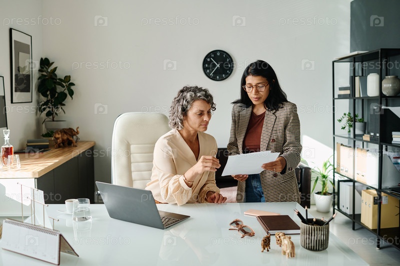 Зрелая босс-женщина просматривает документы, хранящиеся у ее секретарши