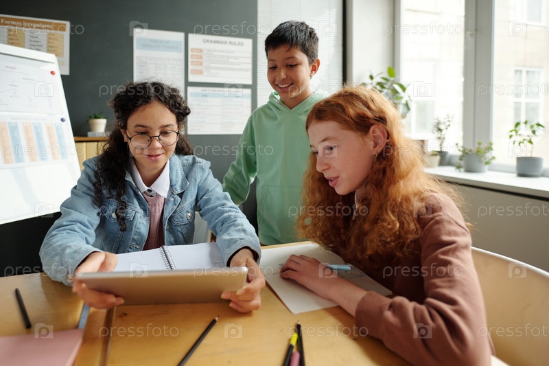 Две милые умные школьницы и ученик смотрят на экран планшета