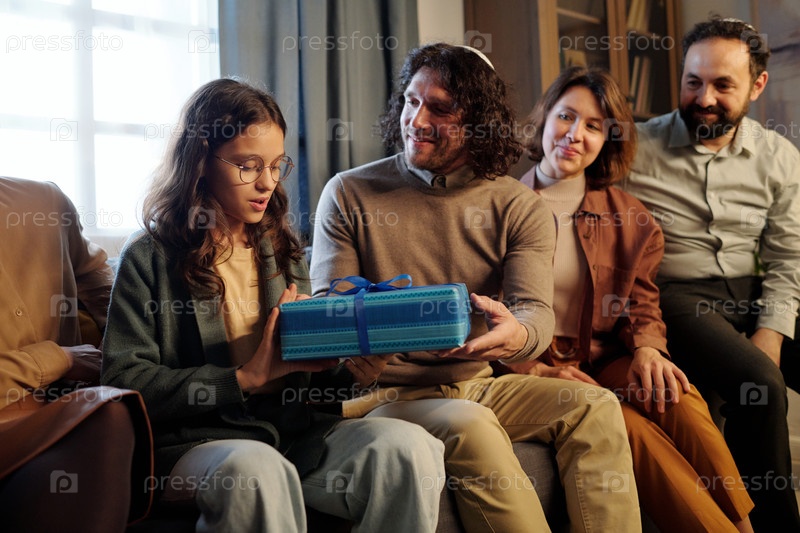 Молодой улыбающийся отец передает своей дочери подарочный ящик с подарком Хануки
